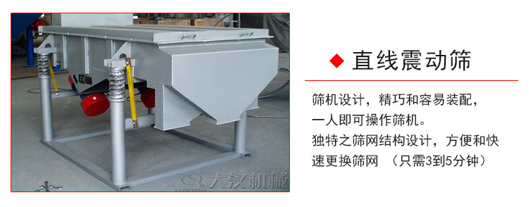 直線震動(dòng)篩利用振動(dòng)電機(jī)激振作為振動(dòng)動(dòng)力來源,使物料在篩網(wǎng)上被拋起,同時(shí)向前作直線運(yùn)動(dòng),物料從給料機(jī)均勻地進(jìn)入篩分機(jī)的進(jìn)料口,通過多層篩網(wǎng)產(chǎn)生數(shù)種規(guī)格的篩上物、篩下物、分別從各自的出口排出。具有耗能低、產(chǎn)量高、結(jié)構(gòu)簡單、易維修、全封閉結(jié)構(gòu),無粉塵溢散,自動(dòng)排料,更適合于流水線作業(yè)。