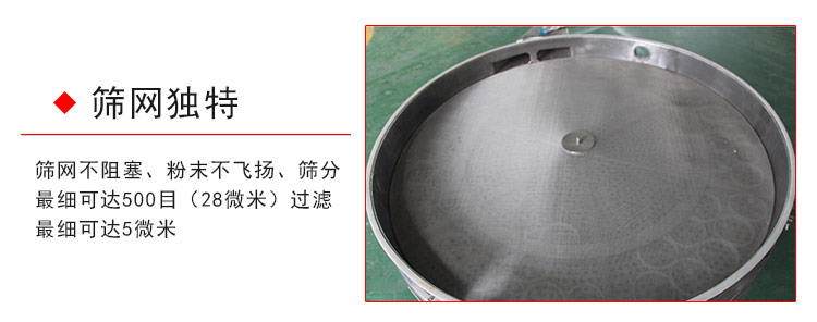 3.篩網不阻塞、粉末不飛揚、篩分可達500目(28微米)過濾可達5微米。