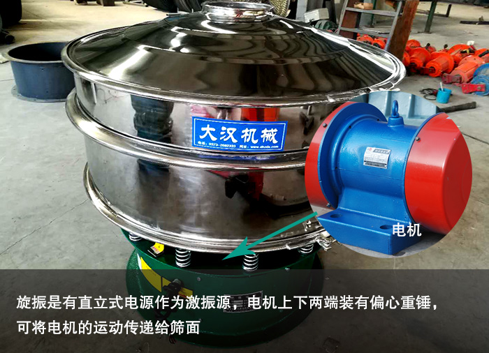 旋振是有直立式電源作為激振源,電機上下兩端裝有偏心重錘,可將電機的運動傳遞給篩面,使物料在篩面上進行運動以達到篩分效果的,篩分過程就被稱之為旋振篩。其篩分機可使用多層篩分的方式其能達到3-5層的篩分。