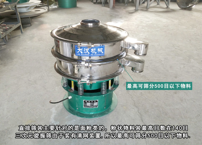 不同的篩分量就會造成其,篩分精度會有一定的差距:直排篩其主要針對的是面粉類的,粉狀物料其高目數在140目三次元旋振篩由于裝有清網裝置,所以高可篩分500目以下物料.