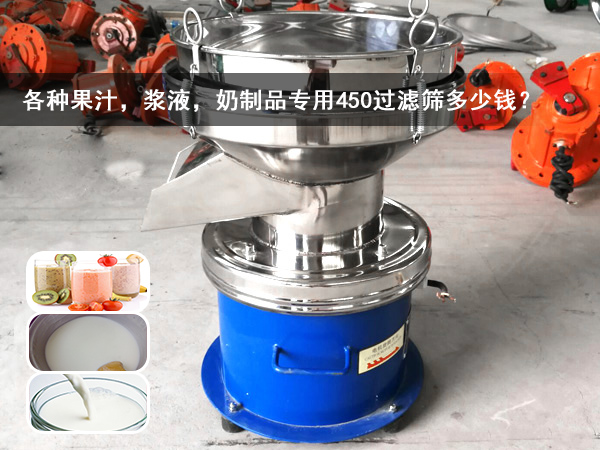 對于各種果汁,漿液,奶制品等物料都有一個特點,其粘性較大為:粘稠物料所以其篩分,需要選用專用的過濾篩。那么對于各種果汁,漿液,奶制品的450過濾篩多少錢呢?
