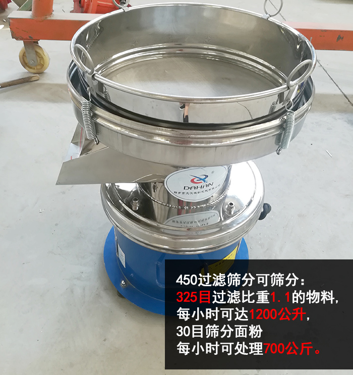 450過濾篩其粉狀物料的篩分可篩分:大顆粒含量的粉末篩分與漿液過濾;325目過濾比重1.1的物料,每小時可達1200公升,30目篩分面粉每小時可處理700公斤。不知這樣的物料篩分量能否符合你的需求。