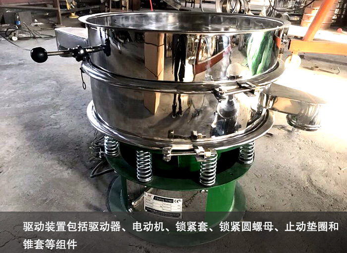 驅動裝置包括驅動器、電動機、鎖緊套、鎖緊圓螺母、止動墊圈和錐套等組件,其中,錐套固定在篩框上,驅動器的驅動軸設置在錐套內并通過鎖緊套來連接固定其位置。本實用新型精細篩分機與現有篩分機相比具有結構先進實用、性能穩定可靠、安裝調試方便、制造費用低等優點。